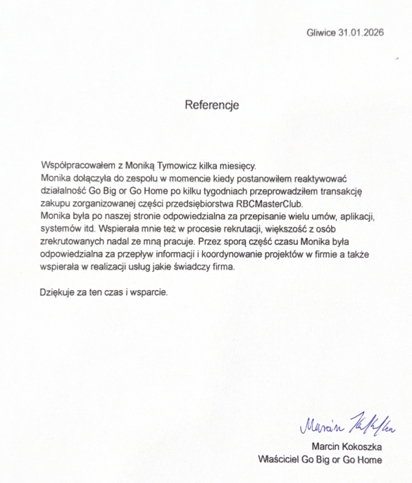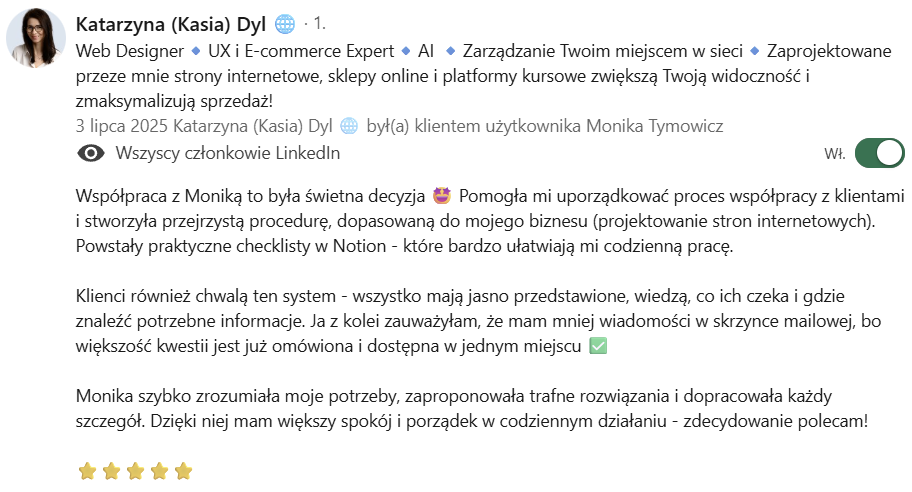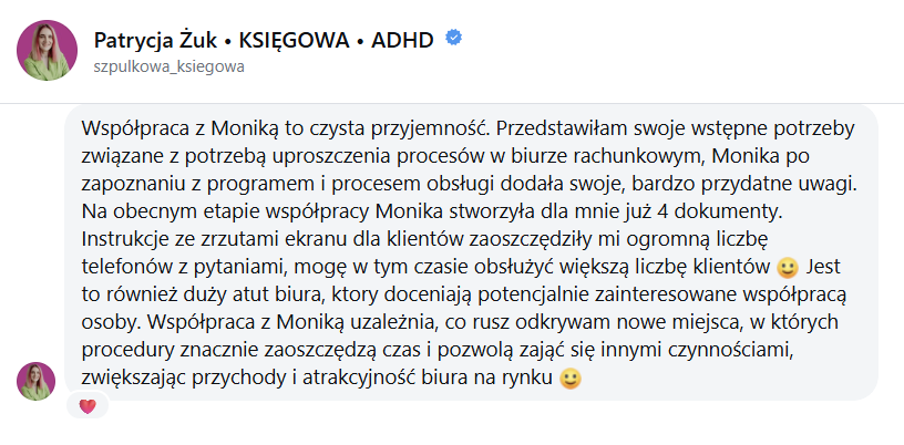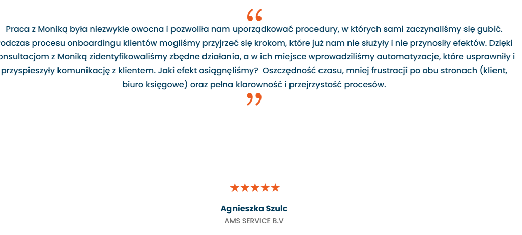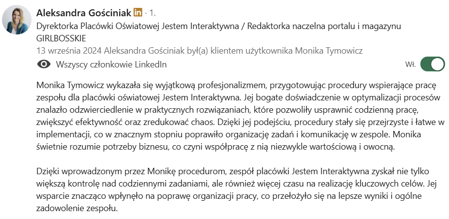 Polecam współpracę z Moniką Tymowicz, która genialnie poukładała procedury w moim biznesie. Dzięki temu wszystko działa jak w zegarku, każdy wie co ma robić, kiedy ma robić, a mój biznes osiąga jeszcze lepsze efekty. Także jeśli także potrzebujecie poukładać sobie rzeczy w swoim biznesie, to współpraca z Moniką będzie genialnym rozwiązaniem. Polecam.