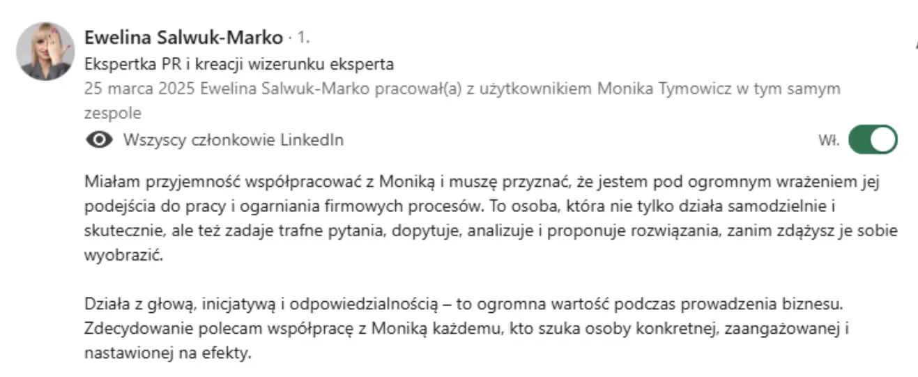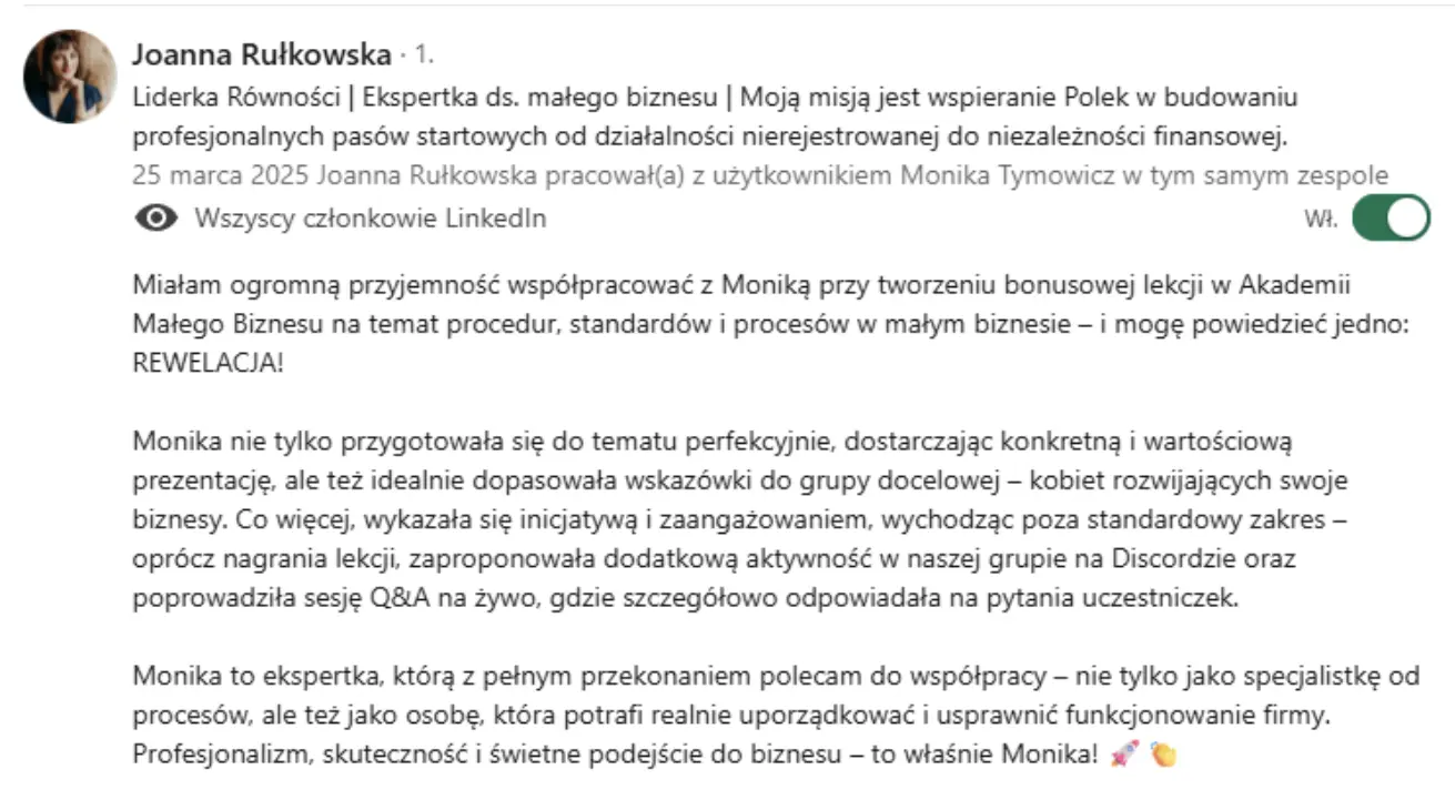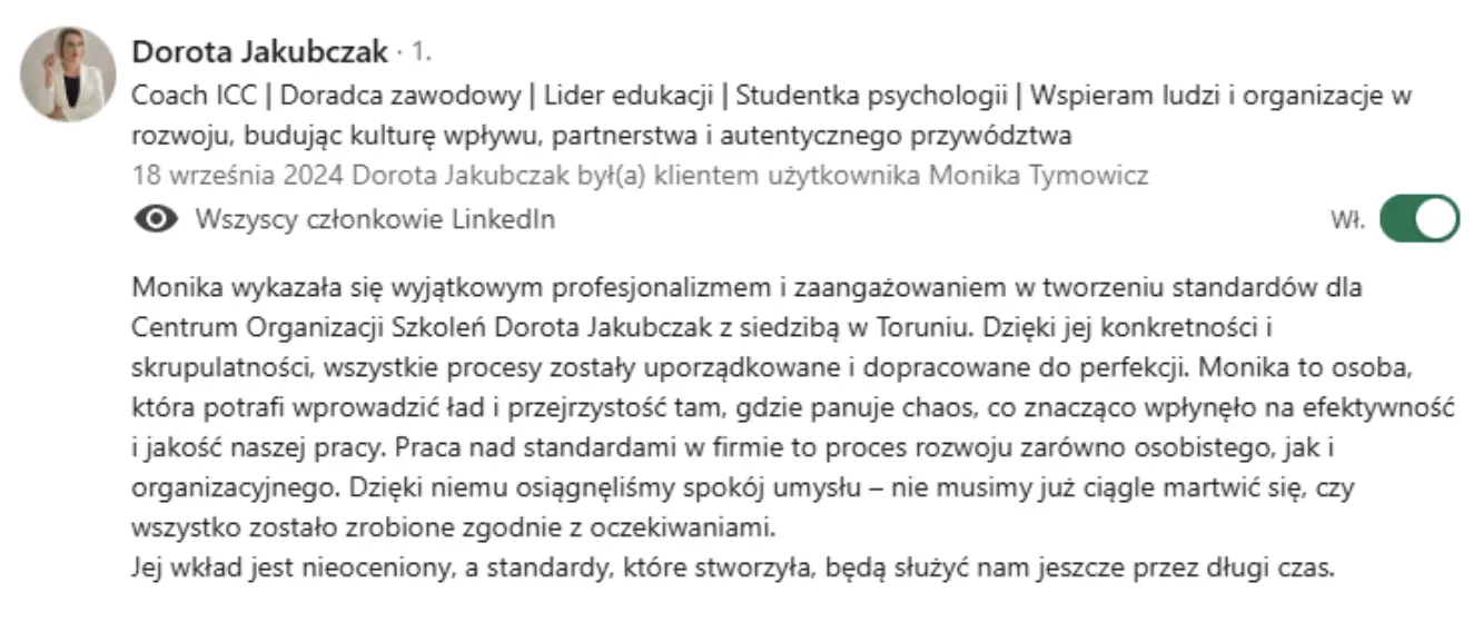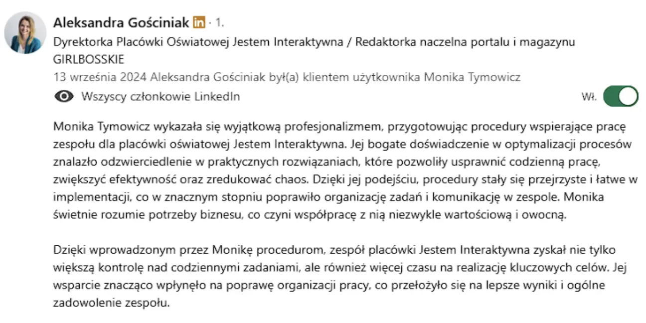 Jestem ekspertką od standaryzacji i optymalizacji procesów oraz Project Managerką.